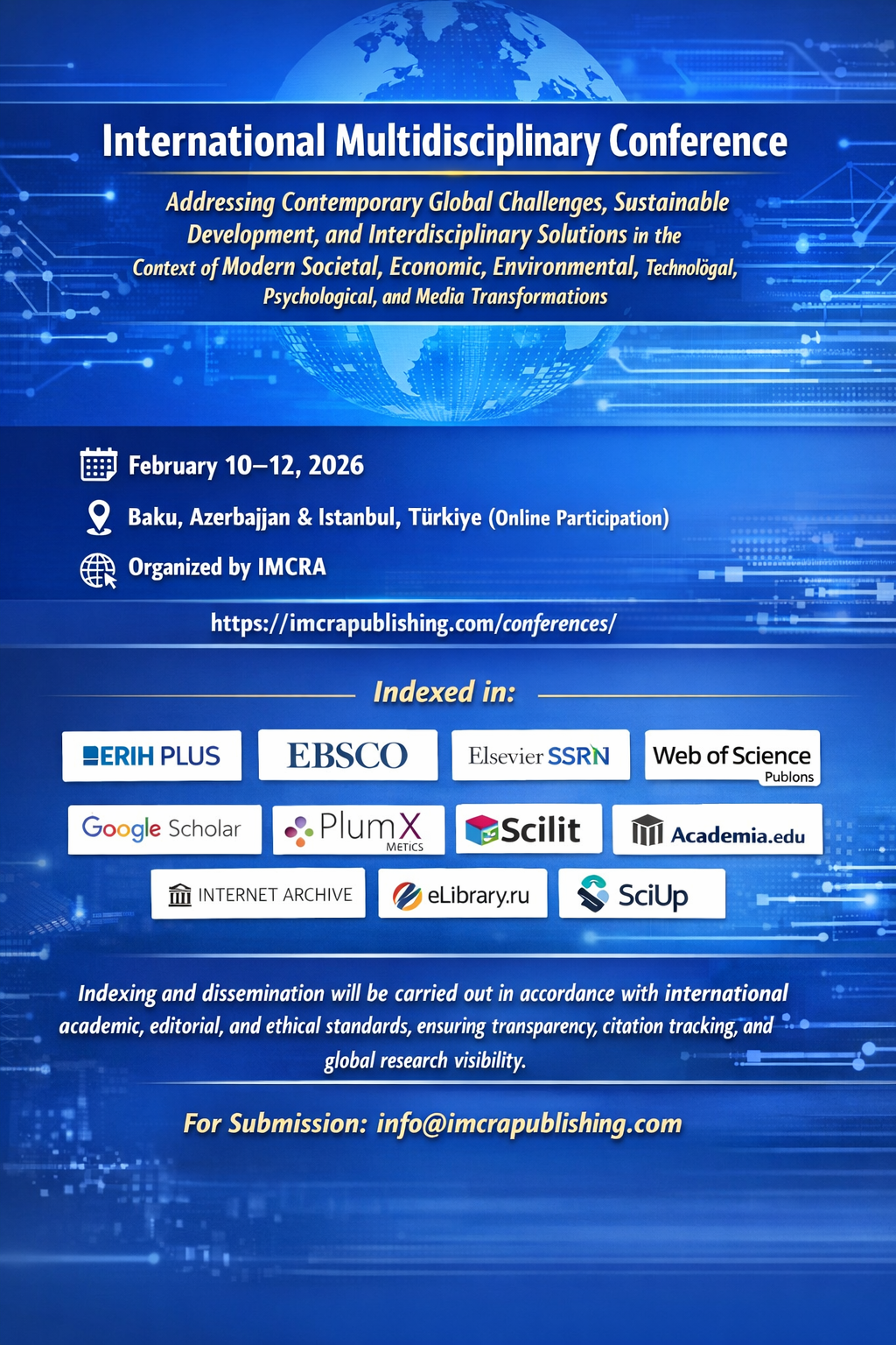 On behalf of the Organizing Committee, it is our distinct honor and sincere pleasure to invite you to participate in the International Multidisciplinary Conference on Science, Education, Technology, and Innovation, to be held February 10–12, 2026, in a hybrid format, with onsite sessions in Baku, Azerbaijan, and online participation coordinated from Istanbul, Türkiye.